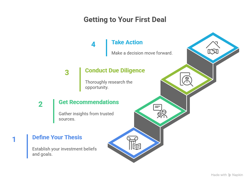 From that came four essential steps—the most direct path from curious observer to committed investor. The steps themselves aren’t complicated, but the order matters. Each one builds the foundation for the next, creating a clear structure that turns general interest into confident decisions. More importantly, this sequence helps break through the decision paralysis many high-earning professionals face when evaluating syndication opportunities for the first time.